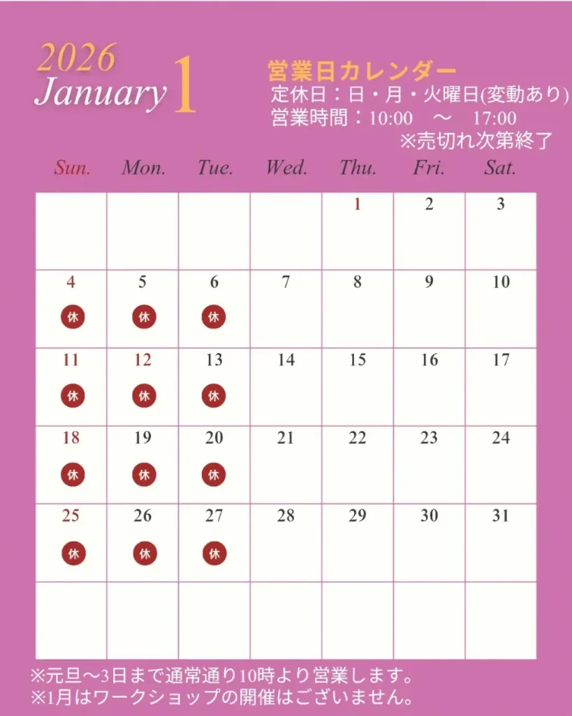 2026年1月の営業カレンダー&ワークショップ情報のご案内 Instagramのフォローお願いします 2026年1月営業日カレンダーです。元旦から3日まで、通常通り10時より営業いたします。初めての年末年始です😊お年賀もご用意しております。ワークショップは、1月は開催出来ません。2月は平日ですが、9日(月)にバレンタインマカロンのワークショップを開催予定です。対象は10歳以上とさせていただきます。23日(月・祝)に、お子様向けのワークショップも開催予定です。 マカロンのご紹介